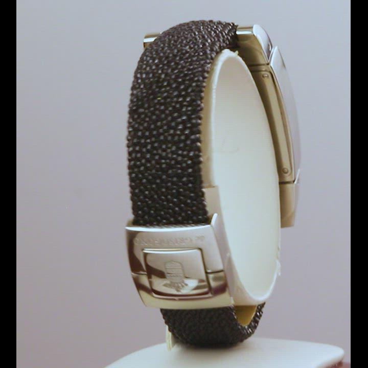Model with rectangular case in polished steel, mobile lugs. Black dial with decorated background, embellished with 64 white diamonds (0.34 carats) and 6 black diamonds at the indexes (0.05 carats) in the upper dial of the local time, at 12 o'clock. Matte black second time dial with Dauphine hands. Black galuchat strap, folding buckle. Quartz movement, water resistance 3 atmospheres. Also available with black dial, 19 diamonds (0.05 carats) on the dual time counter and with steel case.
