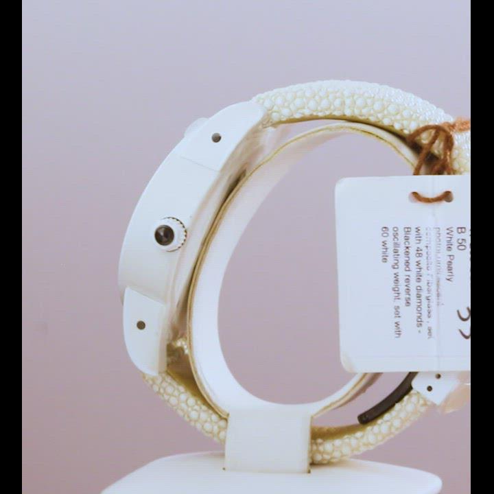 2012 Baselworld and de Grisogono introduce their Tondo By Night Timepieces and in so doing sets Baselworld aglow with color & light. There are six colors that soak up the sun by day & come alight at night in brilliant colors: white pink purple yellow green & orange. The gently oval-shaped watches are housed in a new case material – a pearly photoluminescent composite fiberglass (PLF). The brand worked with an external laboratory to develop this new material which has tiny pieces of mother-of-pearl to give it the very distinctive sheen & color. Work was also done to ensure that the watch was perfectly comfortable to wear. The case size is large but the brand acknowledges the move by women to wear larger watches. All bezels are blackened stainless steel which forms the setting for the precious stones used in each color: diamonds sapphires tsavorites & amethysts. The dial is black continuing the sparkle set by the bezels the reverse oscillating counterweight is set with 60 matching stones used on the bezel. This creates a moving display of color and light.de Grisogono completes the watch with beautiful matching color Galuchat (shark/ray skin) straps.